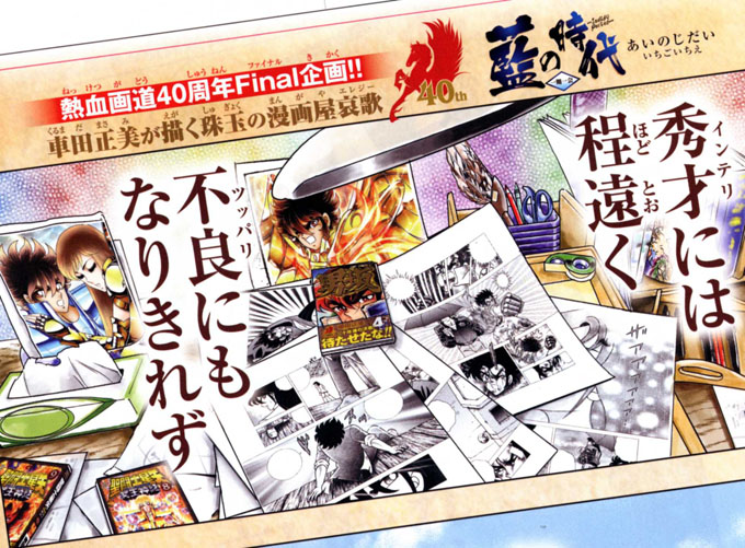 お待たせ致しましたーーー!!車田先生の噂の新連載の最新情報を私、岡田以蔵が満を持して大発表します!タイトルは「藍の時代<一期一会>」!その内容は、フィクションであると明言されてはいるのですが、車田先生自身の青春時代の片鱗が散りばめられた衝撃の自伝的作品であると判明!連載開始は7月中旬もう間もなくです!車田漫画のルーツが明かされるファン感涙の衝撃作に乞うご期待!!<そして全世界待望の…!!!!>星矢NDが同時復活します!こちらも、乞うご期待下さい!!