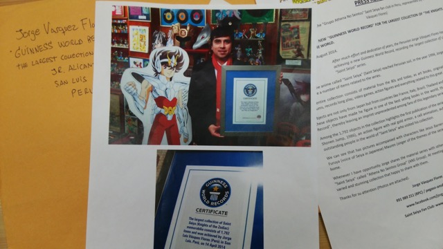 先日、地球の裏側、南米ペルーから車田プロに一通の手紙が!さっそく私、岡田以蔵は乏しい英語力をフル稼働し、なんとかその文面を解読。そこにはペルーの熱烈な星矢ファンであるジョージさんが、長年集めた星矢グッズの保有数でギネス世界一に認定されたとの報告が!星矢に公式な世界記録が存在するのも驚きでしたが、ギネス級の星矢“愛”に頭が下がる思いの私、岡田以蔵でした。