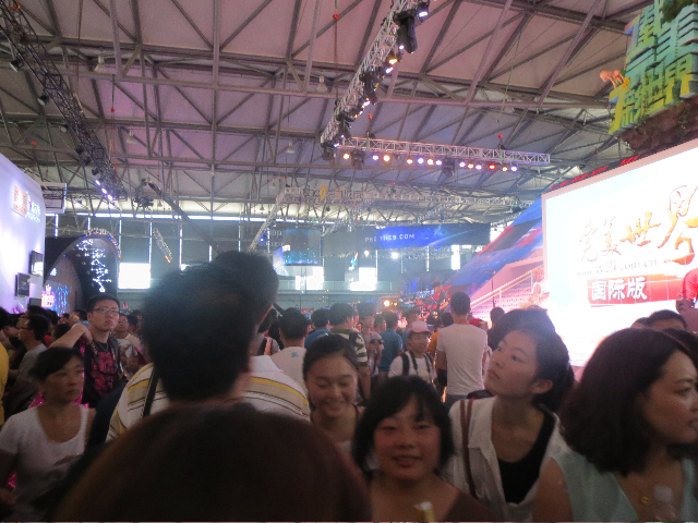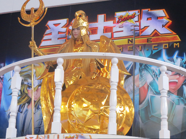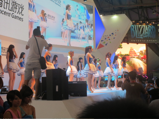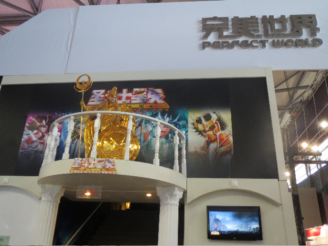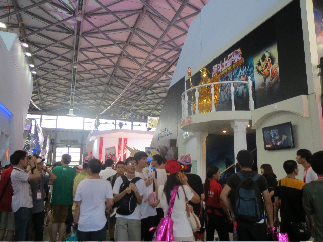 会場内には数万の人だかり。中国では今、オンラインゲームが爆発的人気らしく、ブースでは各企業がPR合戦を熱く繰り広げておりました。最新ゲームの内容よりも、思わず美形コンパニオンやモデル嬢達に目を奪われてしまう、不謹慎な己を必死に戒めながら会場内を進むと…ひときわ観衆の注目を集めるブースを発見!!それもそのはず、そこには神々しいばかりの美しき女神アテナの姿が!